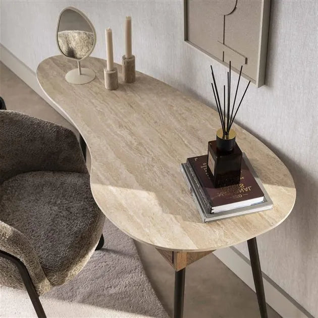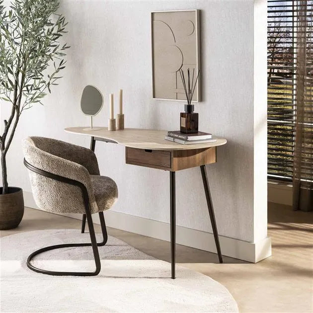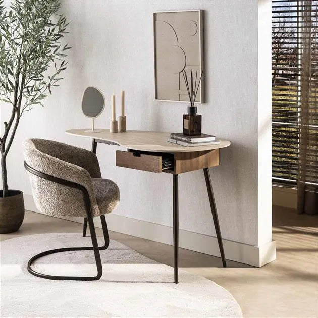 La Coiffeuse Céramique et Acier séduit par son plateau en céramique aux formes organiques, sublimé par une finition travertin au rendu minéral raffiné. Ses lignes douces apportent une sensation de légèreté et de modernité, faisant de cette coiffeuse une pièce décorative à part entière. Elle trouve naturellement sa place dans une chambre ou un espace beauté élégant, où design et bien-être se rencontrent.