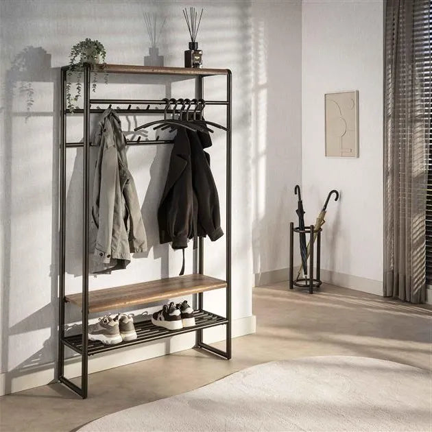 Pensé pour une utilisation quotidienne fonctionnelle, le Meuble Porte-Manteau 11 Crochets est équipé d’une tringle idéale pour les manteaux longs et d’étagères arrondies en aspect chêne, parfaites pour disposer chapeaux, chaussures ou paniers. L’association du bronze et de l’effet bois crée un contraste harmonieux, aussi élégant que pratique. Chaque élément trouve naturellement sa place pour une entrée toujours ordonnée.