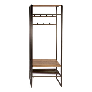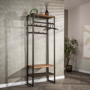 Ce porte-manteau combine une tringle de suspension, sept crochets et deux étagères arrondies pour accueillir facilement manteaux, sacs, chapeaux et chaussures. Il permet d’organiser l’essentiel avec style, tout en gardant votre entrée accueillante et bien ordonnée.