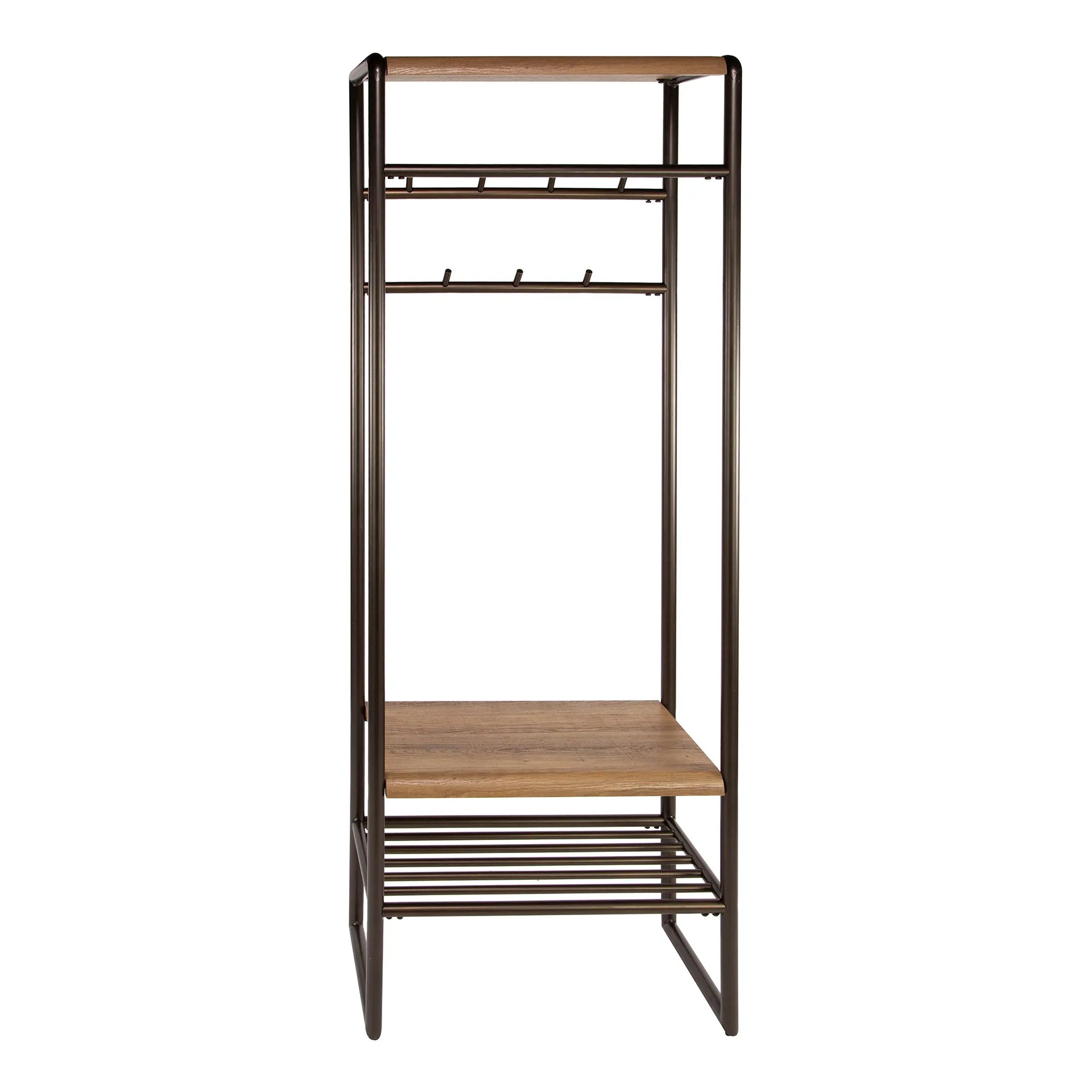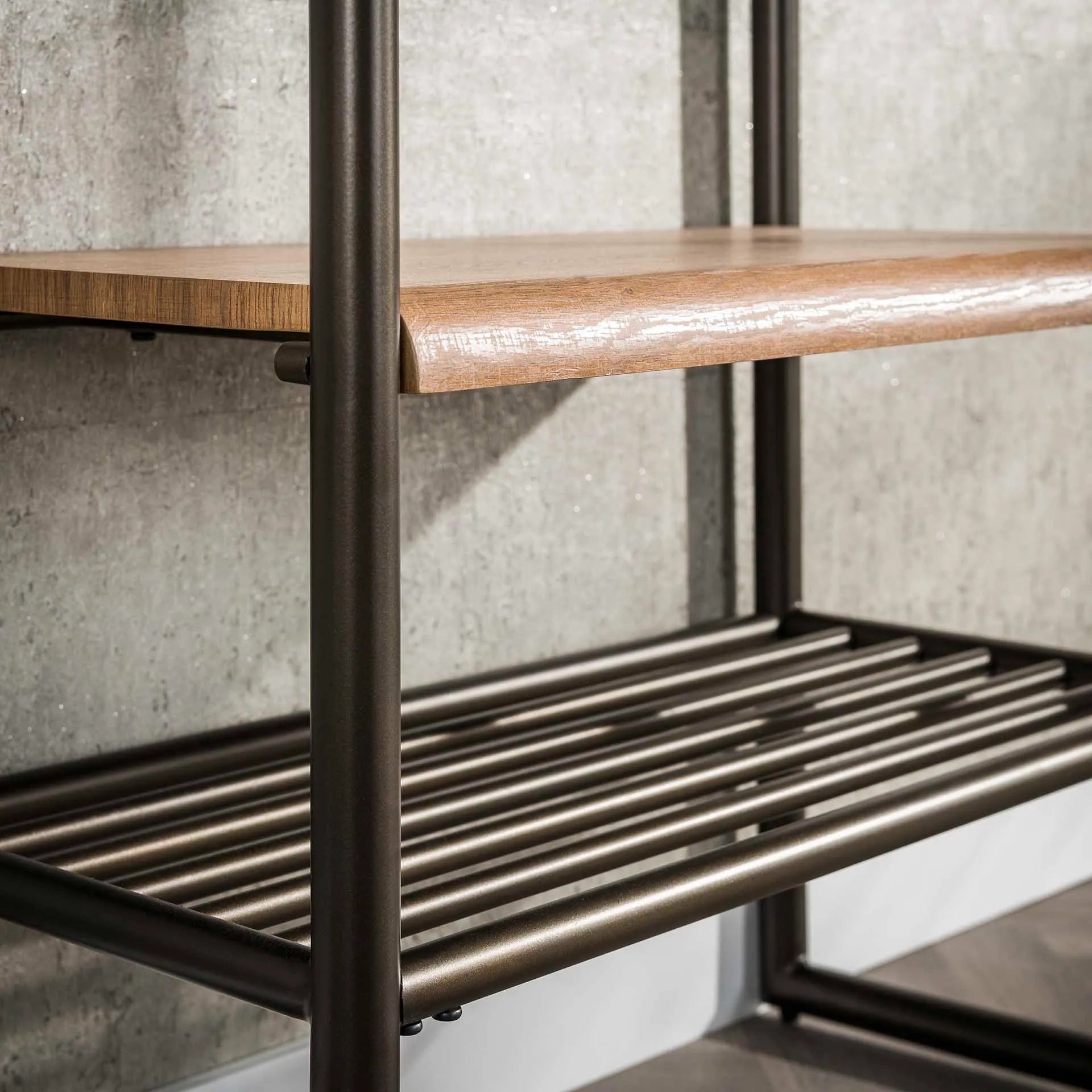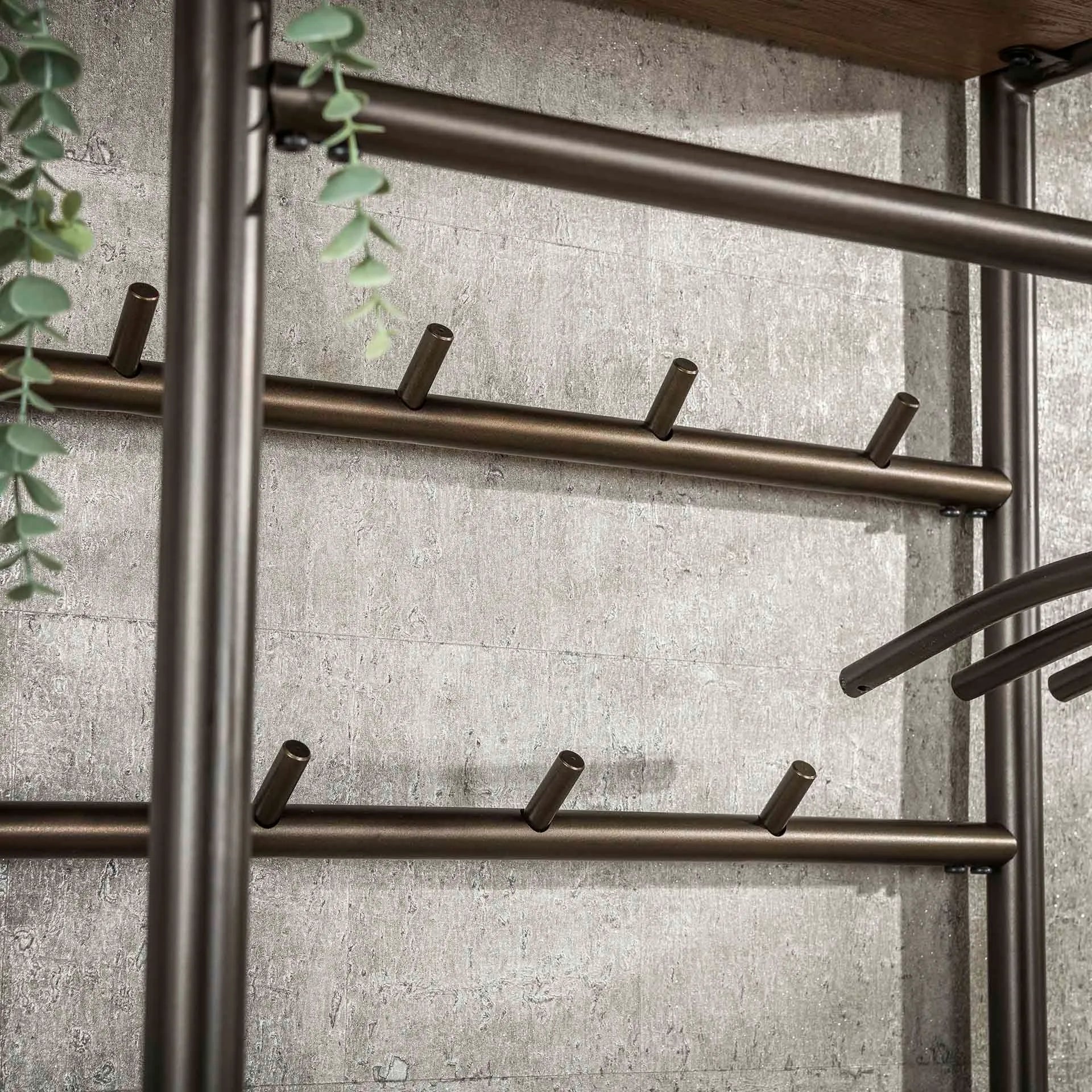Apportez une touche de modernité à votre entrée avec ce meuble porte-manteau design, pensé pour sublimer l’espace tout en offrant un rangement optimal. Grâce à sa structure en acier bronze thermolaqué et ses étagères aspect chêne, il allie élégance, praticité et durabilité au quotidien.