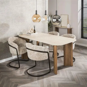 La Table à Manger Céramique 180cm repose sur quatre pieds élégamment courbés en imitation chêne, apportant une touche chaleureuse et naturelle à l’ensemble. Ce piètement assure une excellente stabilité tout en renforçant l’allure contemporaine de la table. L’association du bois et de la céramique crée un équilibre parfait entre modernité et authenticité, pour une salle à manger au style affirmé.