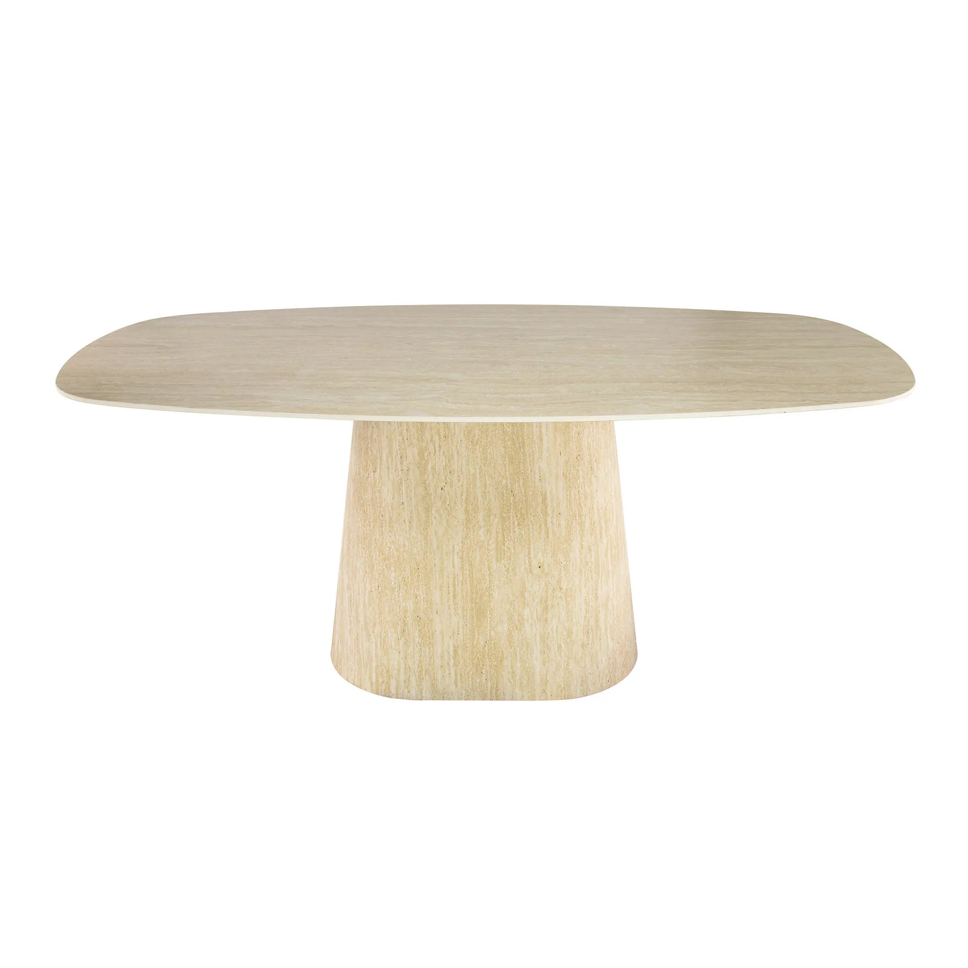 Le plateau en céramique est conçu pour résister au quotidien : anti-rayures, anti-taches et supportant les températures élevées sans marquage. Idéale pour les familles comme pour les amateurs de design, elle ne nécessite aucun entretien particulier. Son piètement central, lui aussi avec une finition imitation travertin, assure stabilité et durabilité tout en maximisant l’espace pour les jambes.