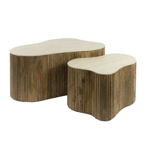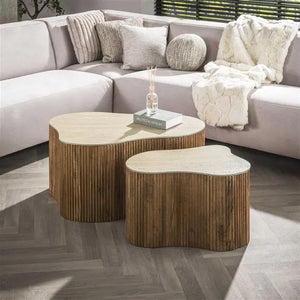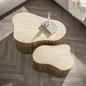 Le piètement en bois de manguier, avec sa finition couleur sable, apporte chaleur et douceur à l’ensemble. Son motif ondulé, inspiré des reliefs naturels, complète parfaitement les lignes organiques des plateaux. Cette Table Basse Céramique Design devient ainsi un véritable objet décoratif, aussi fonctionnel que captivant, capable de transformer l’ambiance d’un salon.
