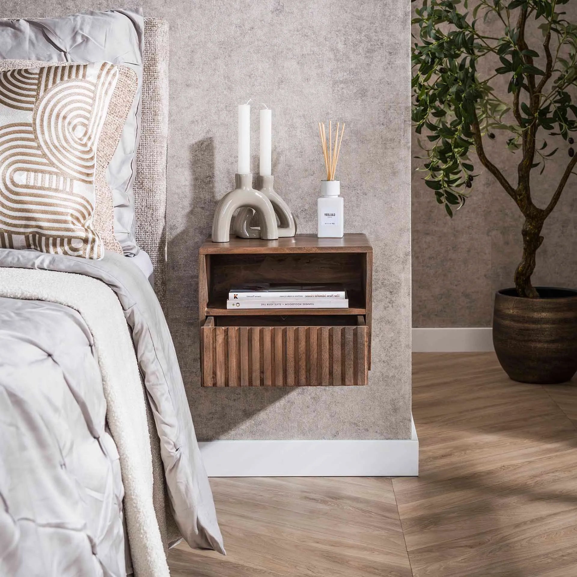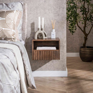 La table de chevet en acacia massif se distingue par son allure contemporaine et minimaliste. Son design suspendu donne une impression de légèreté, parfait pour les intérieurs modernes où chaque détail compte. Fixée au mur à l’aide de deux vis, elle libère le sol et facilite l’entretien tout en offrant un rendu visuel harmonieux et équilibré. Son esthétique épurée s’adapte à tous les styles de décoration, du scandinave au contemporain, en passant par le style nature chic.